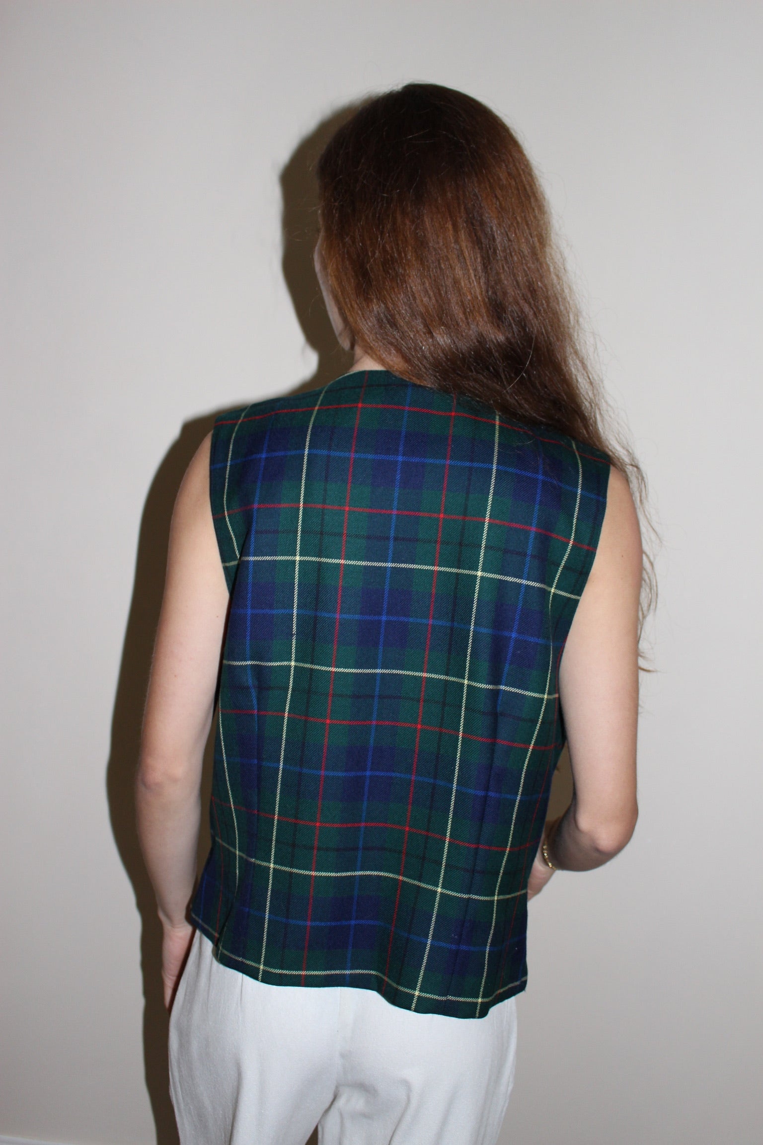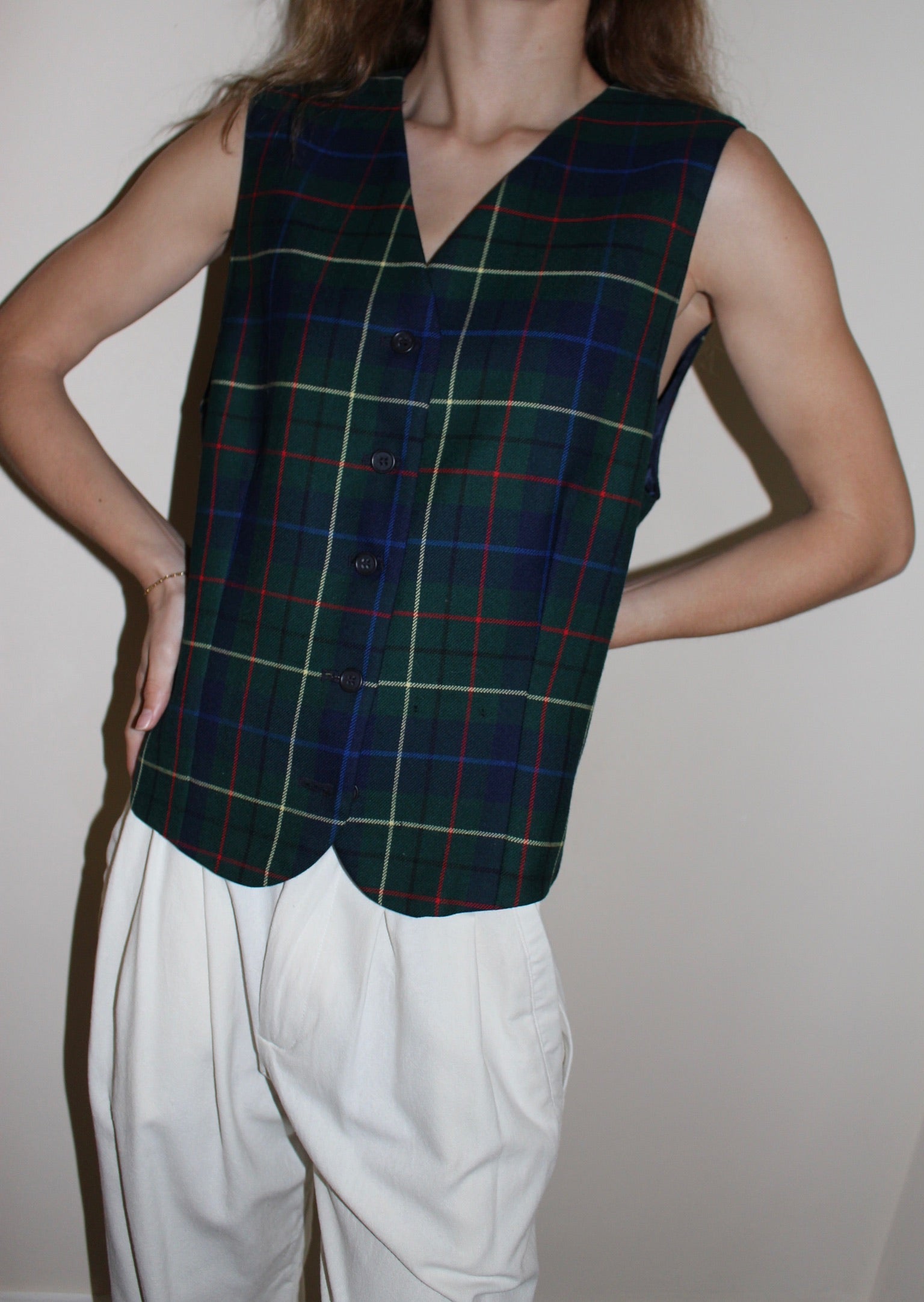 Classic tartan vest by Pendleton in lovely colors of forest green, midnight blue & crimson red. Features a twilled look to the wool with front buttons and a lined interior.