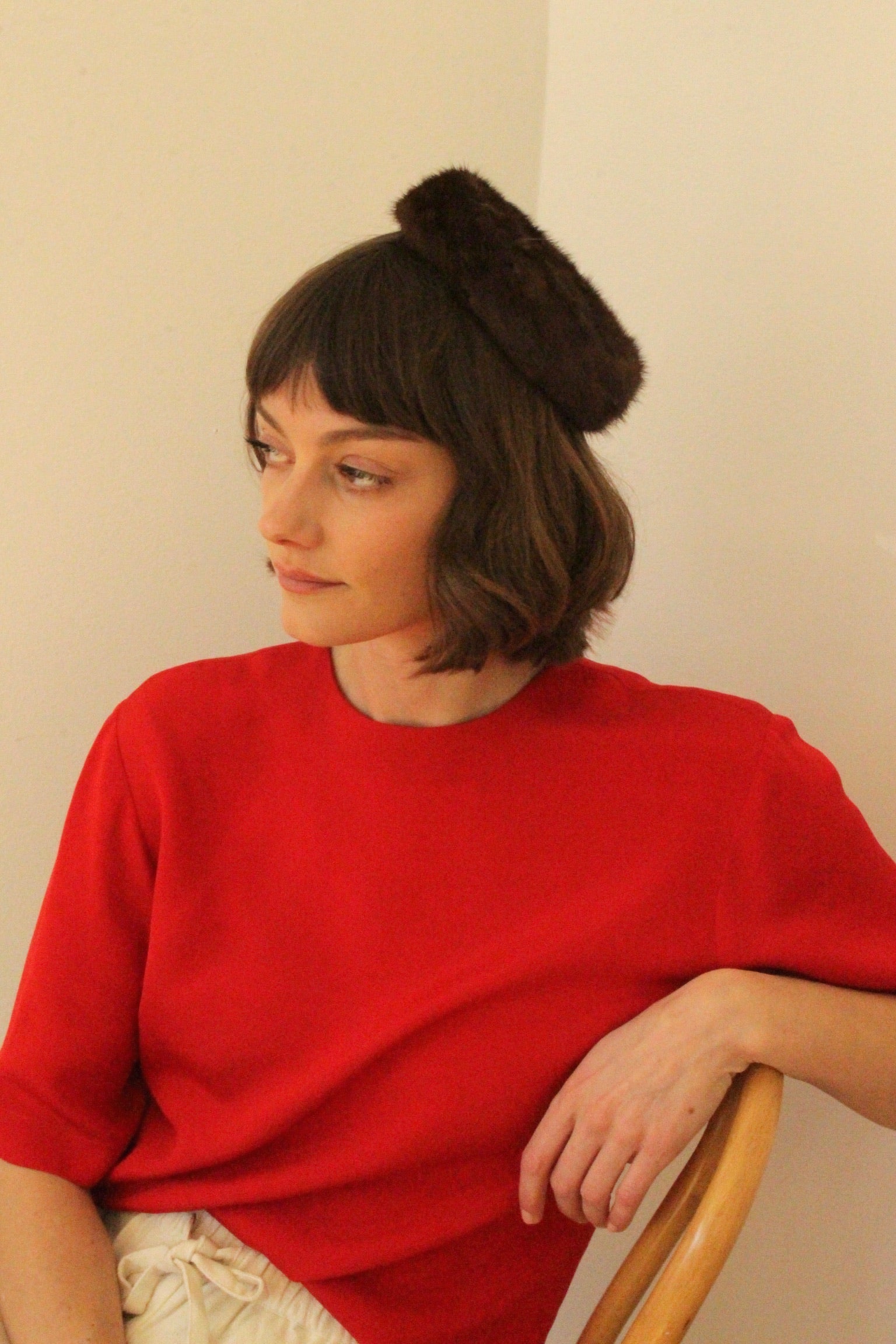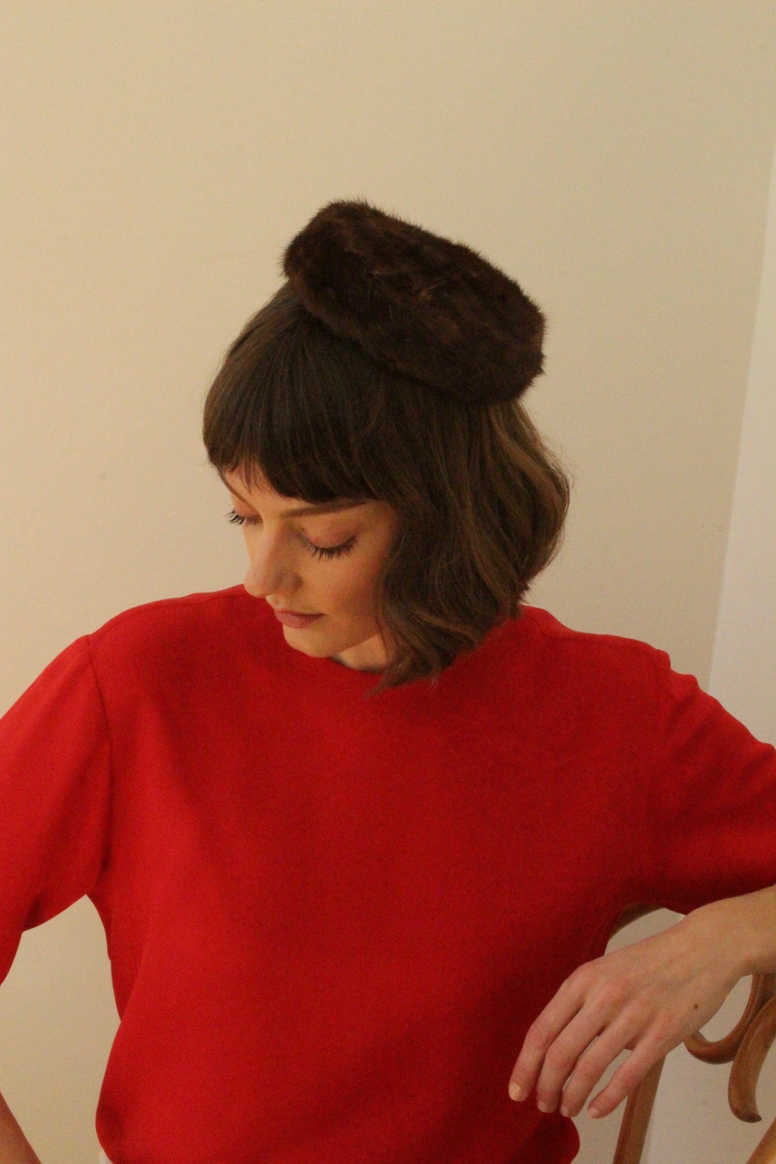 Loveliest vintage hat in a petite, pillbox style with a deep walnut coloring to the fur. Features a structured design and a lined interior. Includes a small comb to fasten hat in your hair!