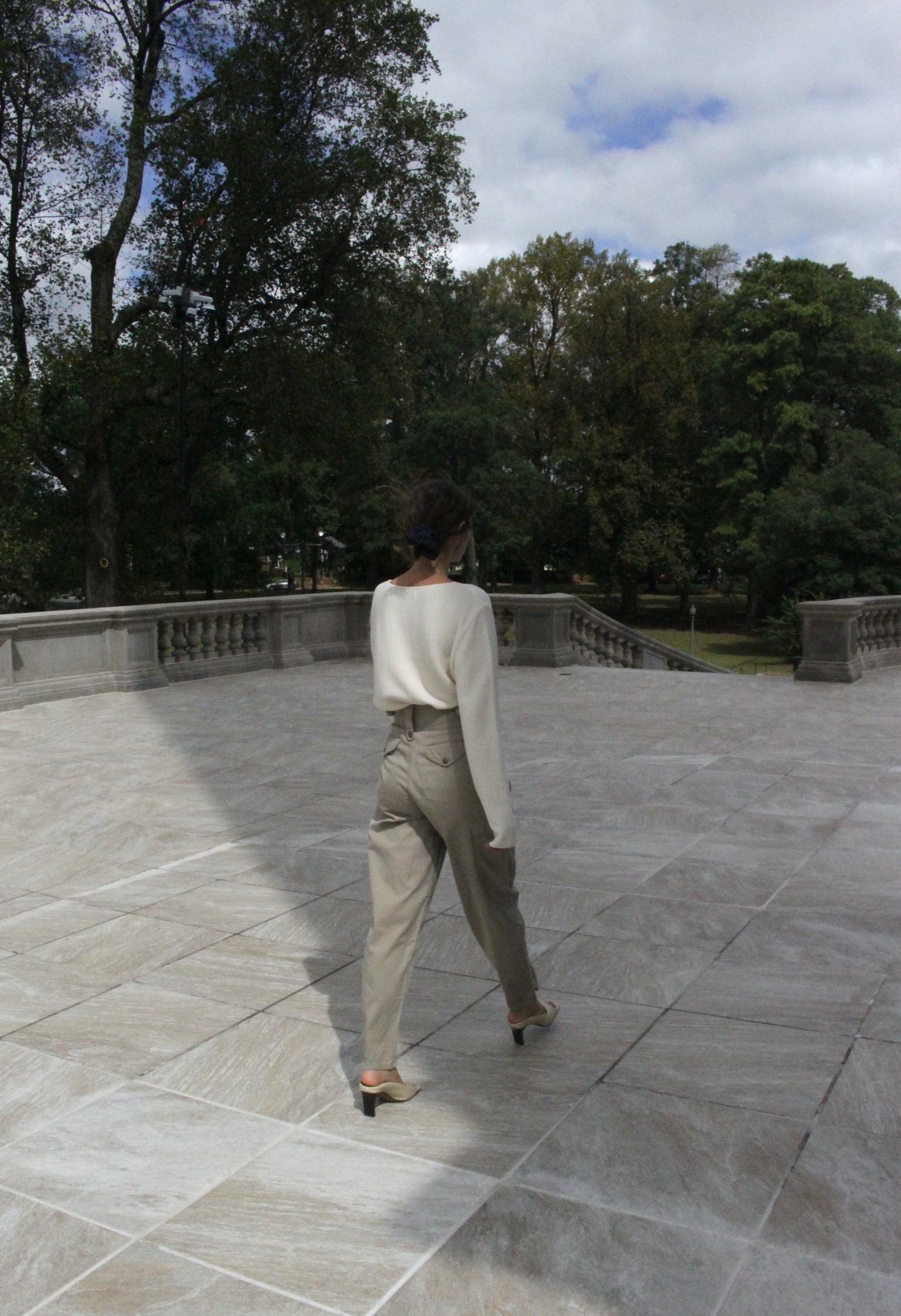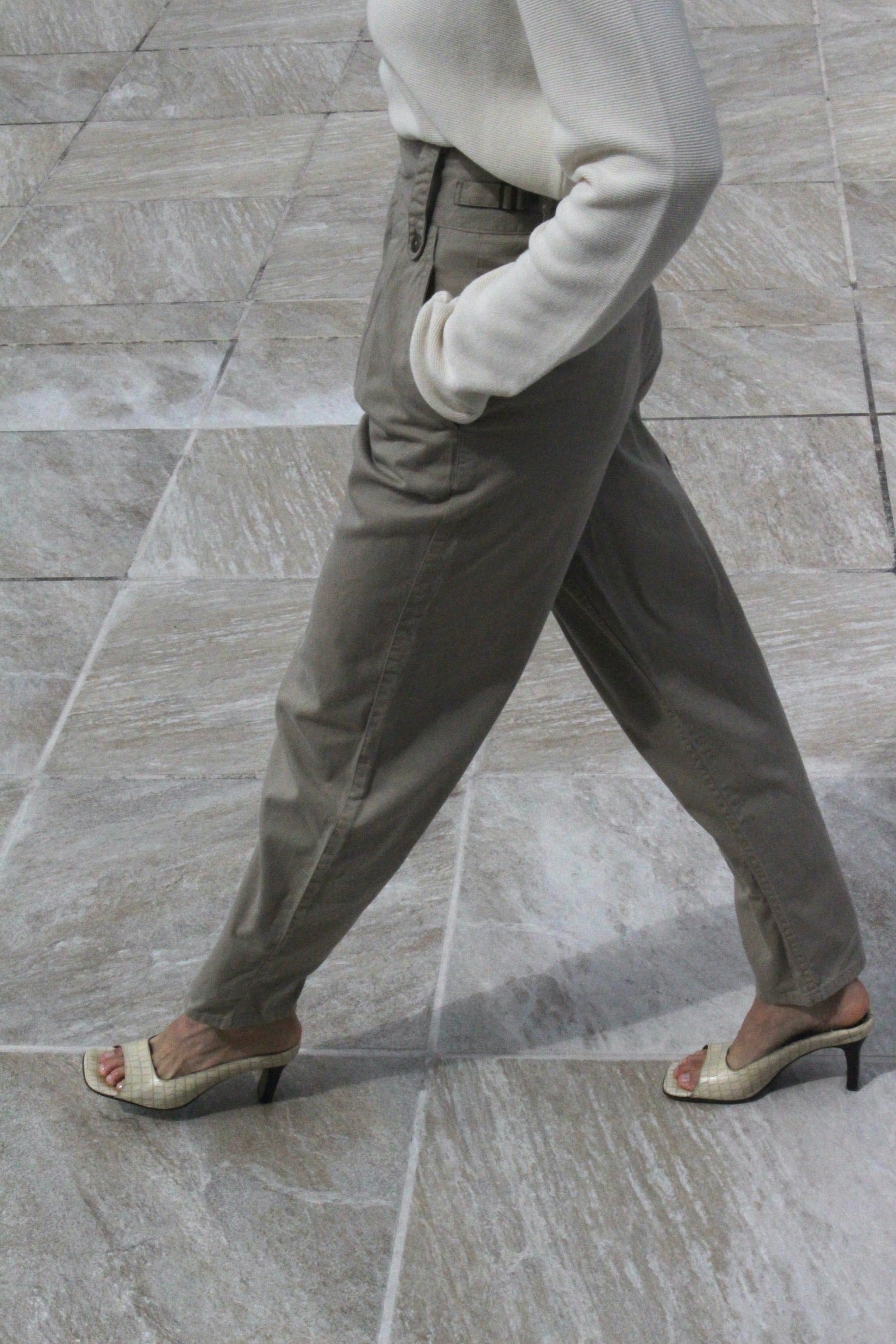 Our favorite cargo-style trousers in a thin, twilled cotton. Trousers have an ultra high-rise fit with wide belt loops, four upper pockets and one large side pocket. Features side belt adjustments and a wider fit to the legs.