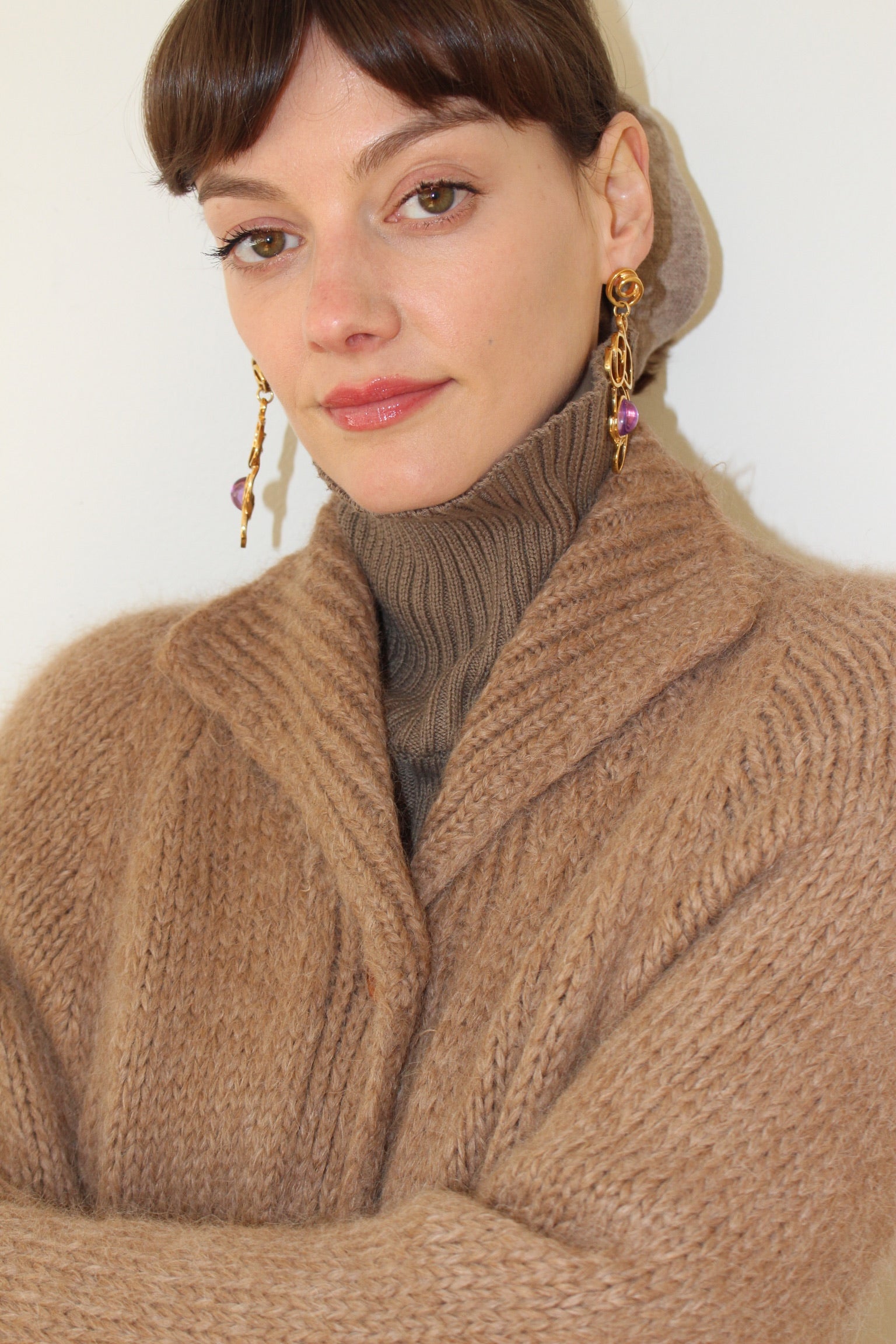Beautiful vintage earrings with a large, abstract gold ribboned design. Features a spiral at the top with post backings and a domed, faux amethyst gem set below.