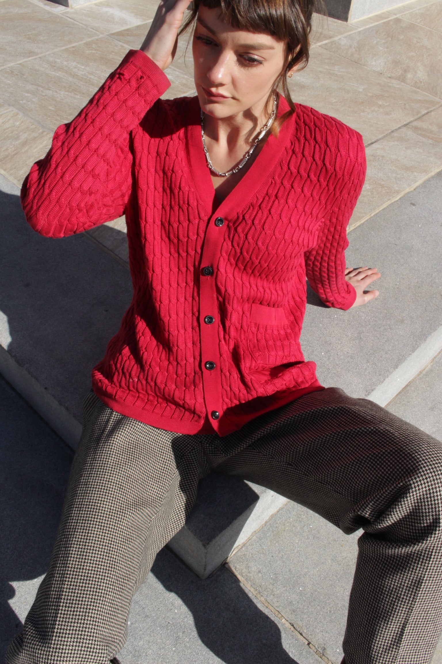 A classic, elegant style by Salvatore Ferragamo in a rich red color & soft cotton fabric. Cardigan has a cable knit pattern throughout, petite buttons up the front and two small pockets at the left side.
