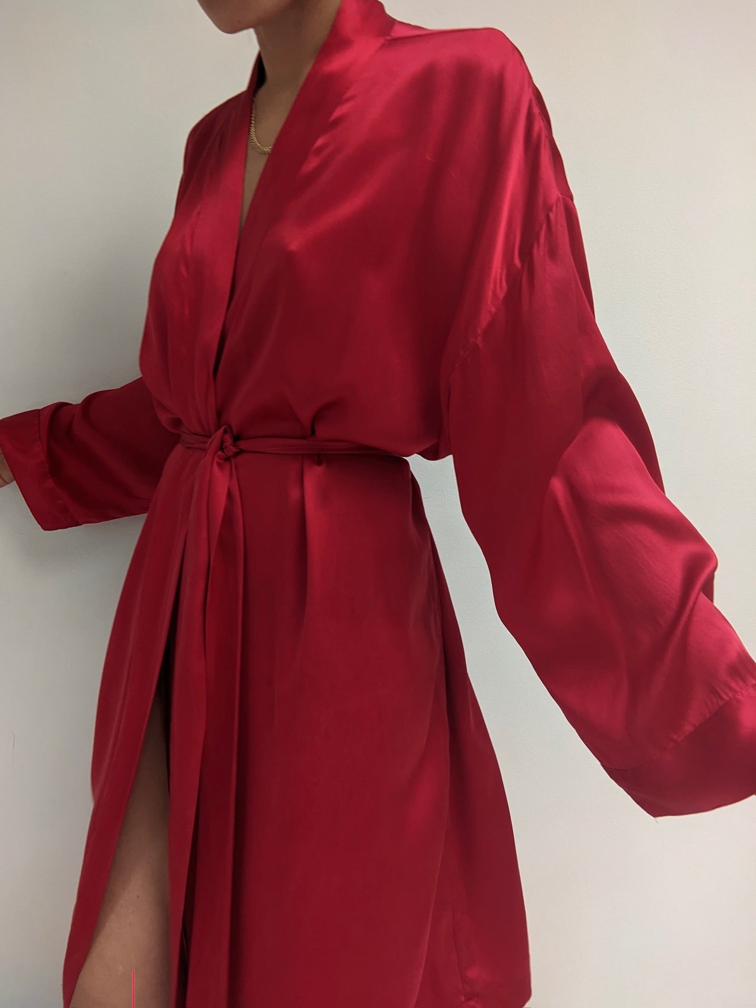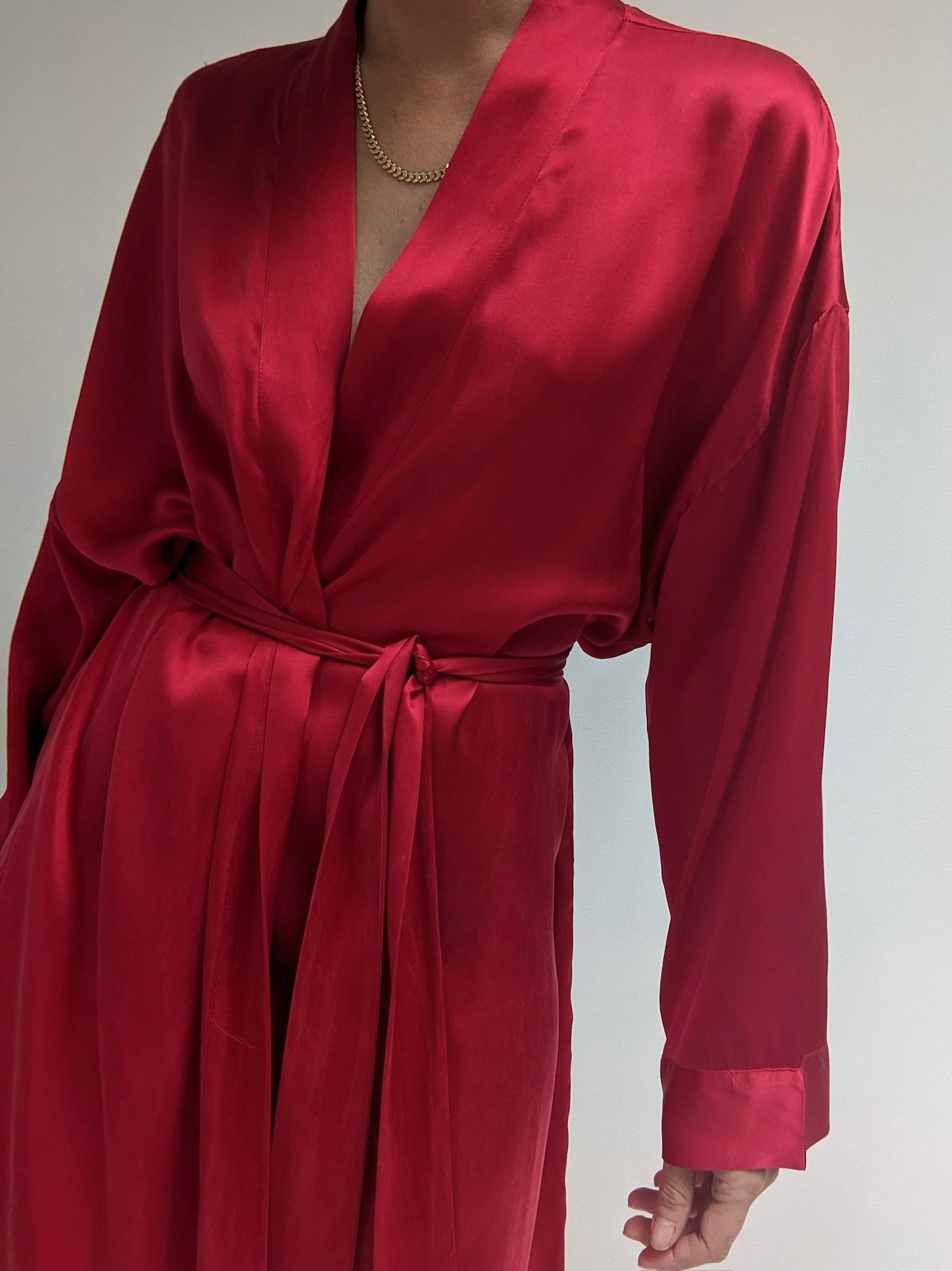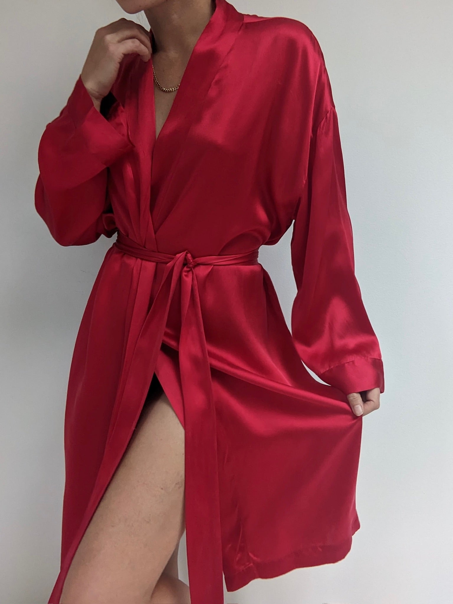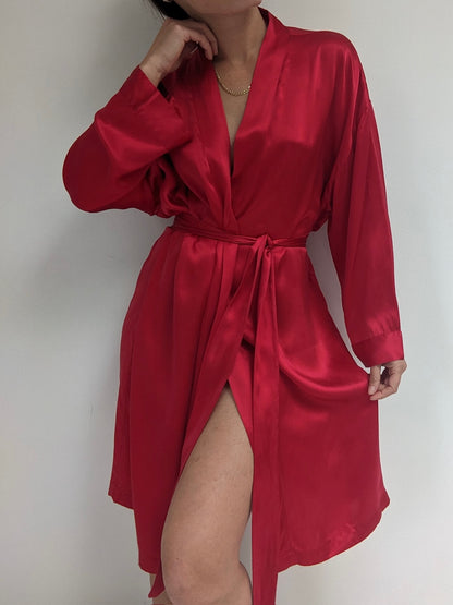 Gorgeous scarlet red silk robe by 90s classic, Victoria's Secret. This piece is a step above with their gold label - featuring a stitched (at the back) sash, long sleeves and set in the softest silk charmeuse.