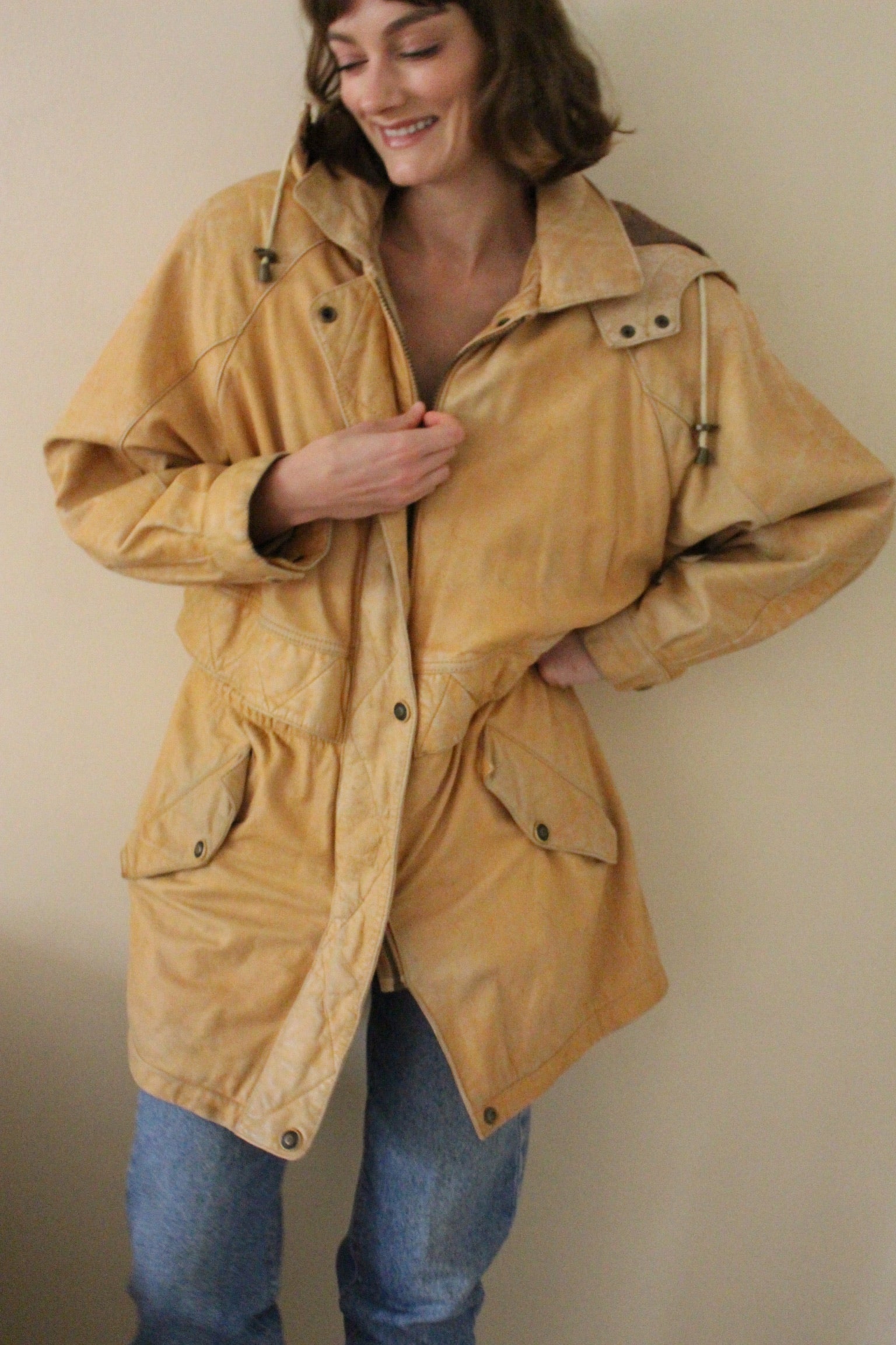 Amazing lined & hooded jacket set in a soft and supple camel toned leather. The jacket has a raglan seam at the sleeve, zipper at the front, multiple pockets throughout the front sides and a drawstring at the hood. The hood is also completely removable if desired.