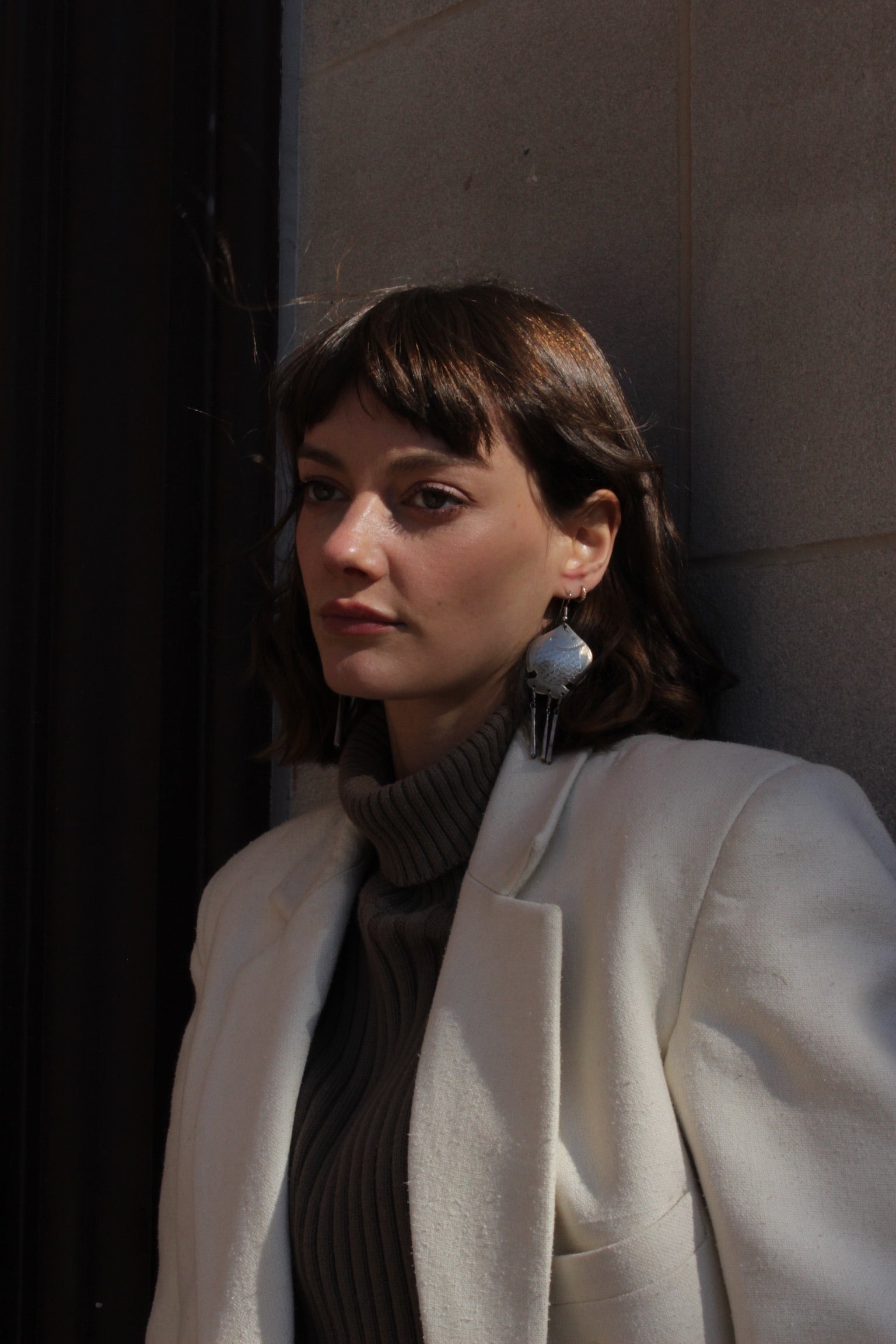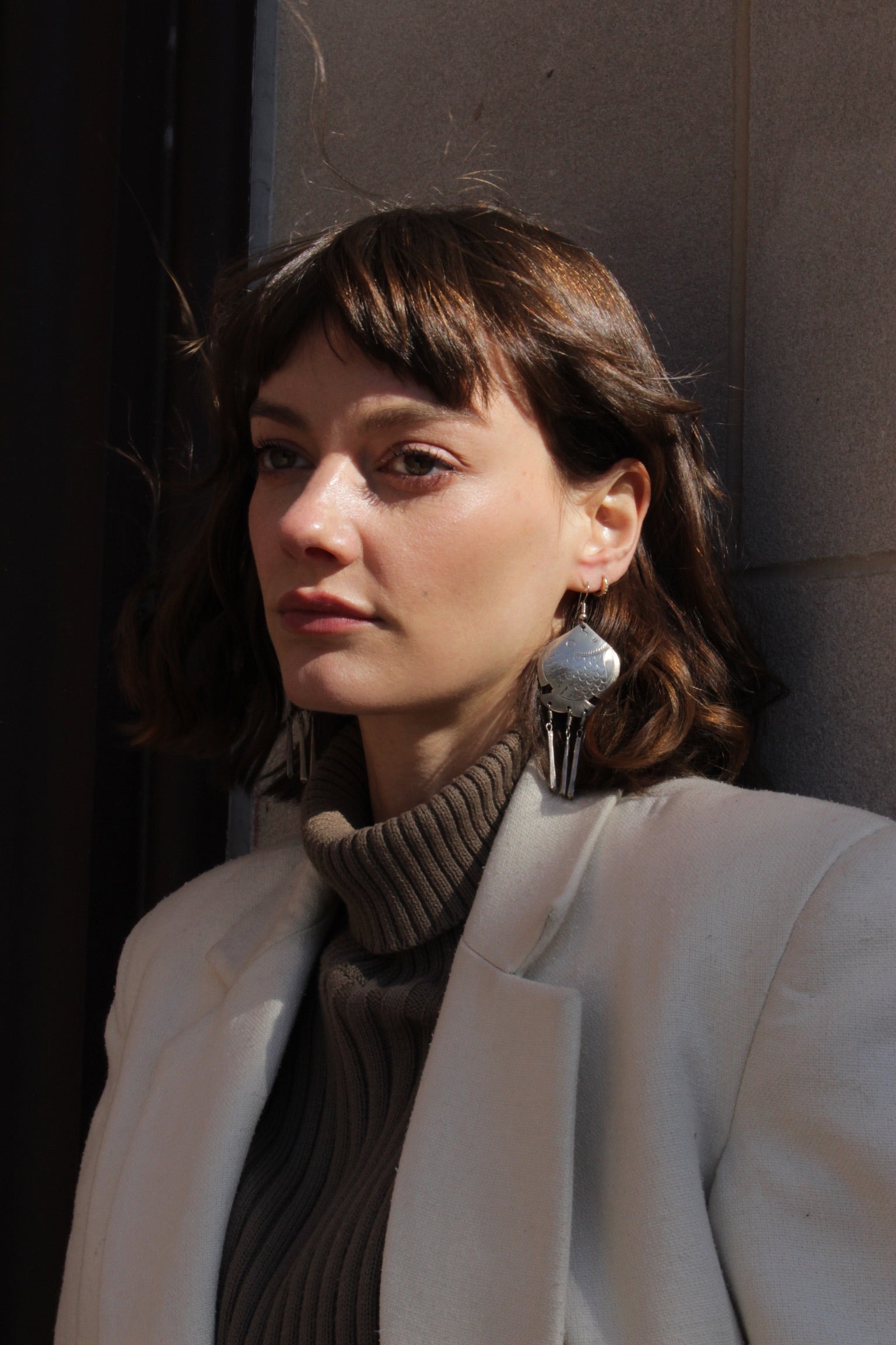 Absolutely amazing vintage earrings in a bright silver color & ultra-thin fish shape. Features etched detail on the figure and hanging silver bars below.