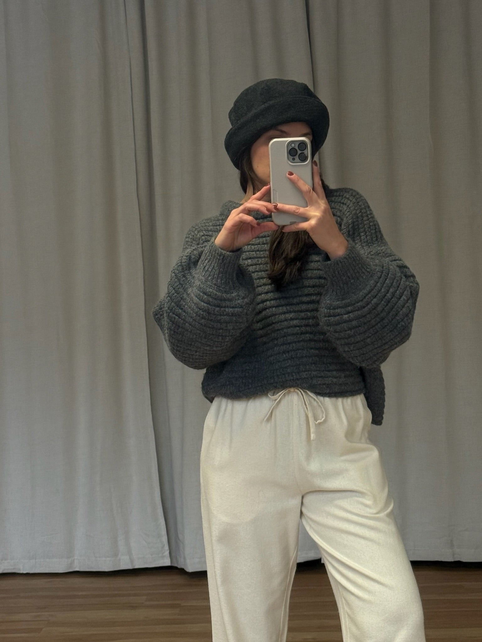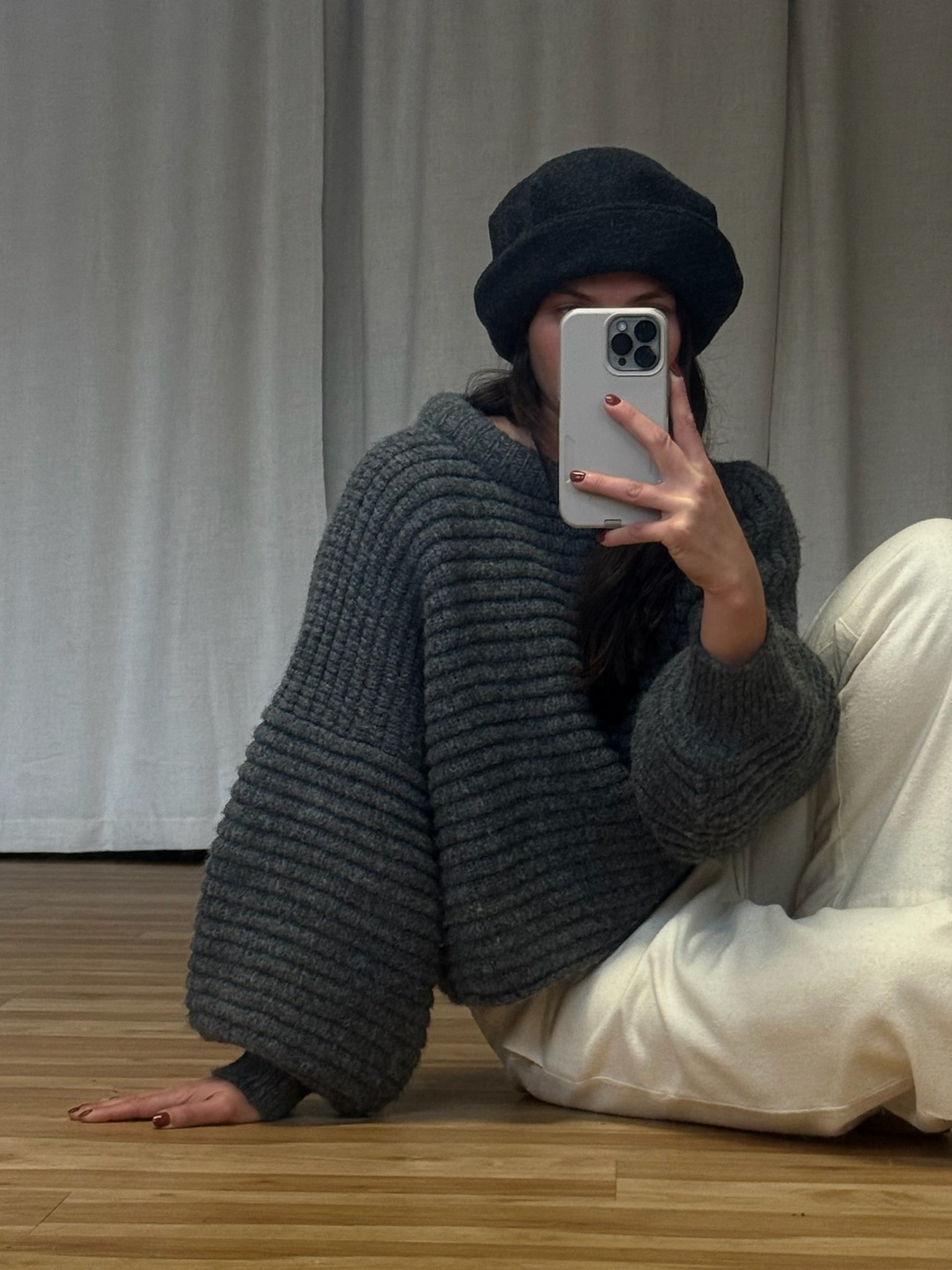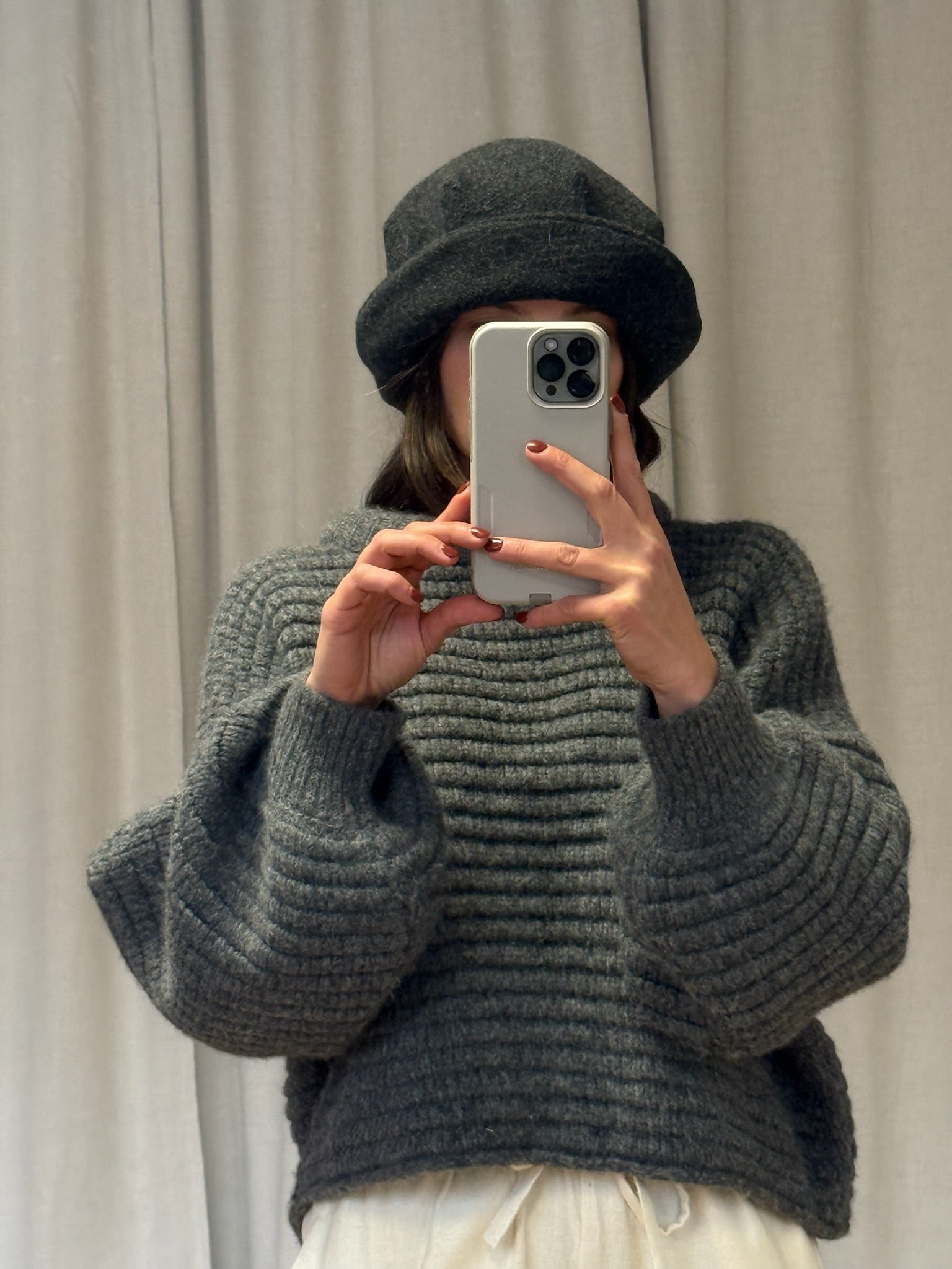 Cozy vintage Italian woven wool hat in a deep smoke grey. Hat has subtle pleats at the upper, a 3" brim that looks lovely folded or down and an incredibly comfortable, snug fit.