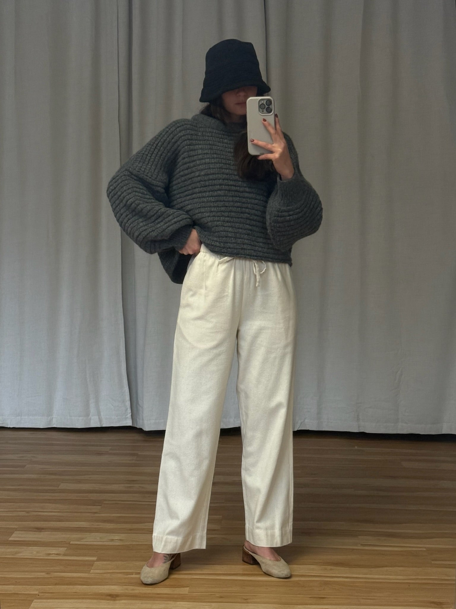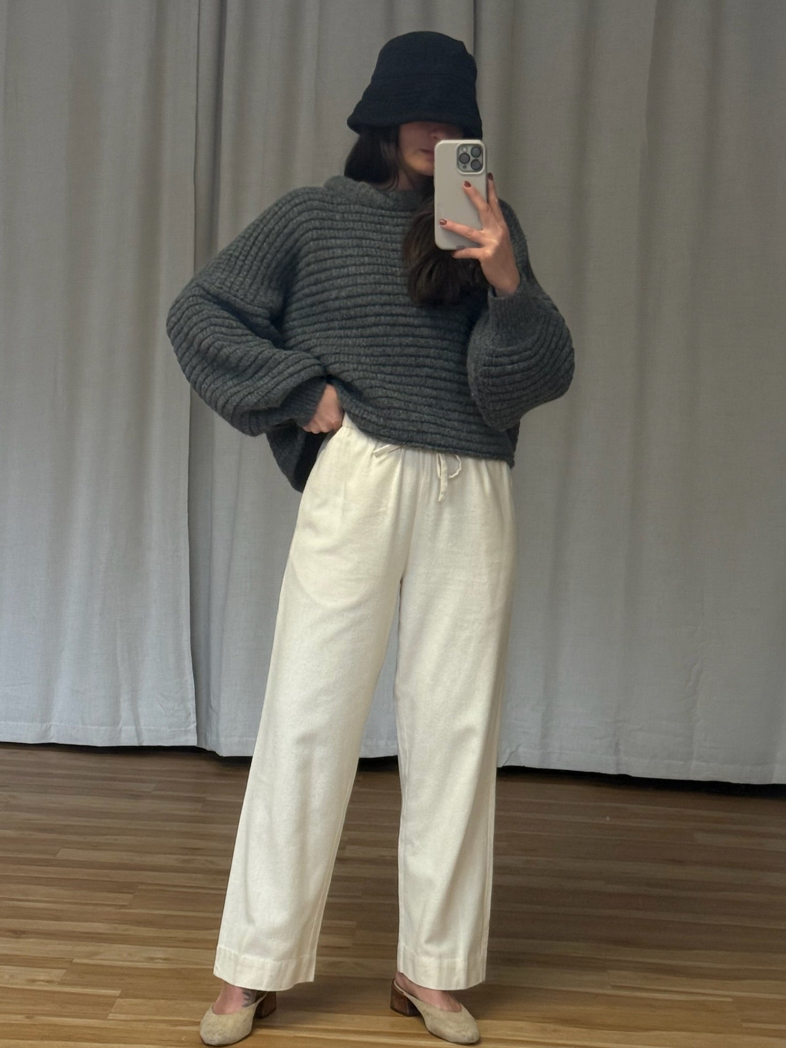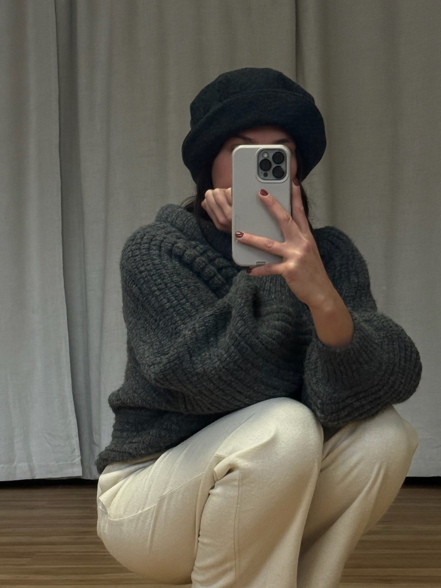 Cozy vintage Italian woven wool hat in a deep smoke grey. Hat has subtle pleats at the upper, a 3" brim that looks lovely folded or down and an incredibly comfortable, snug fit.