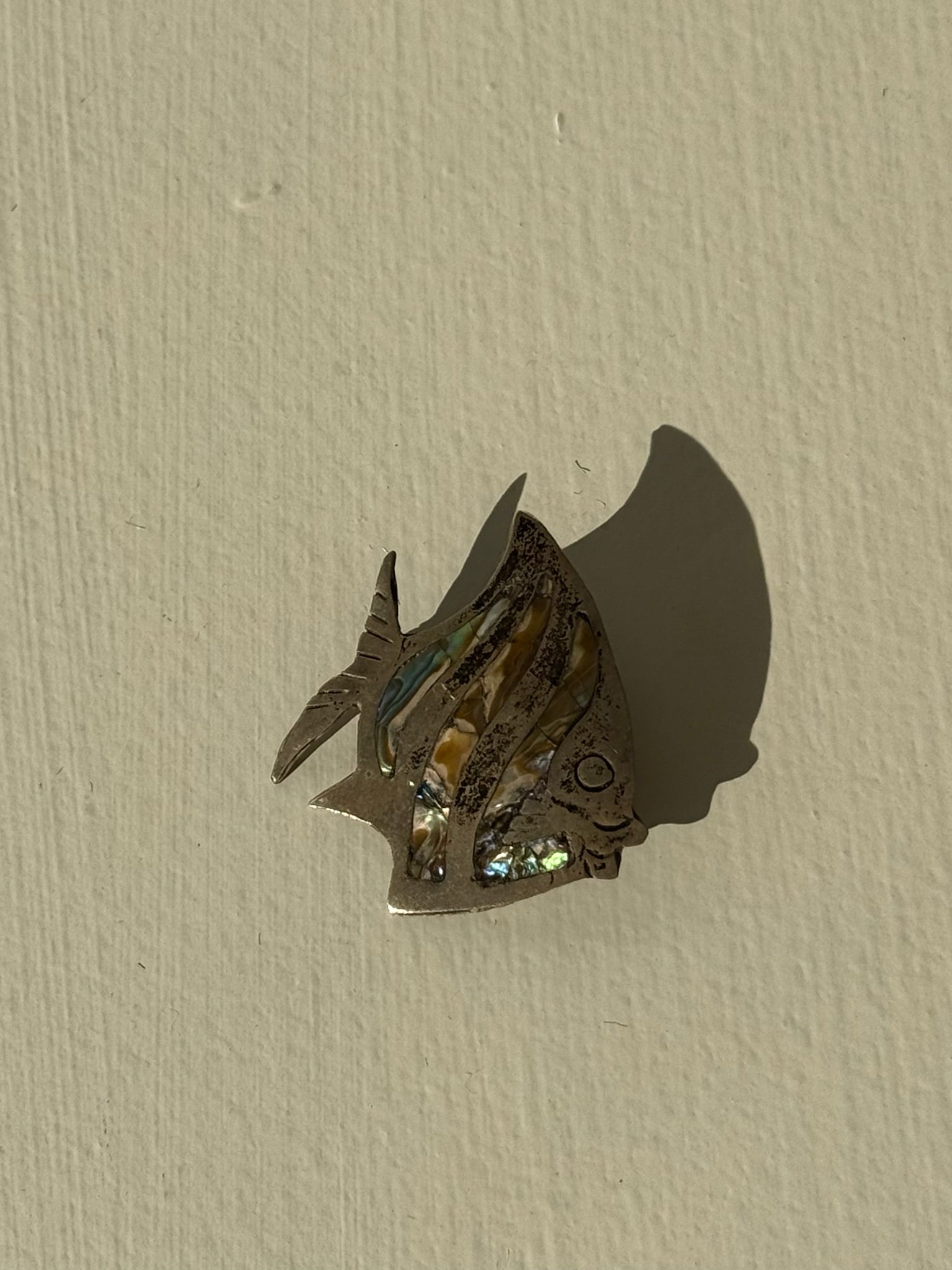 Vintage sterling silver brooch in a large, flat fish cut. Brooch has a stunning abalone setting in a classic iridescent shade.