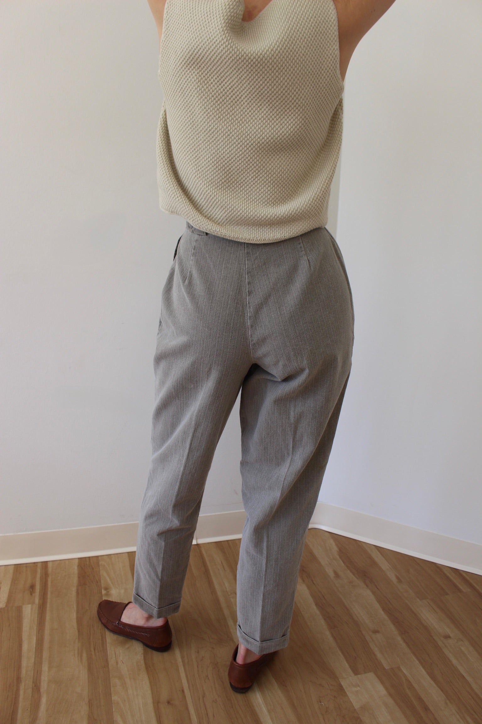 Faded stone grey trousers in our favorite pleated design & lightweight cotton fabric. Trousers have a high-rise fit with thick belt loops, side pockets and a tapered, cuffed leg.