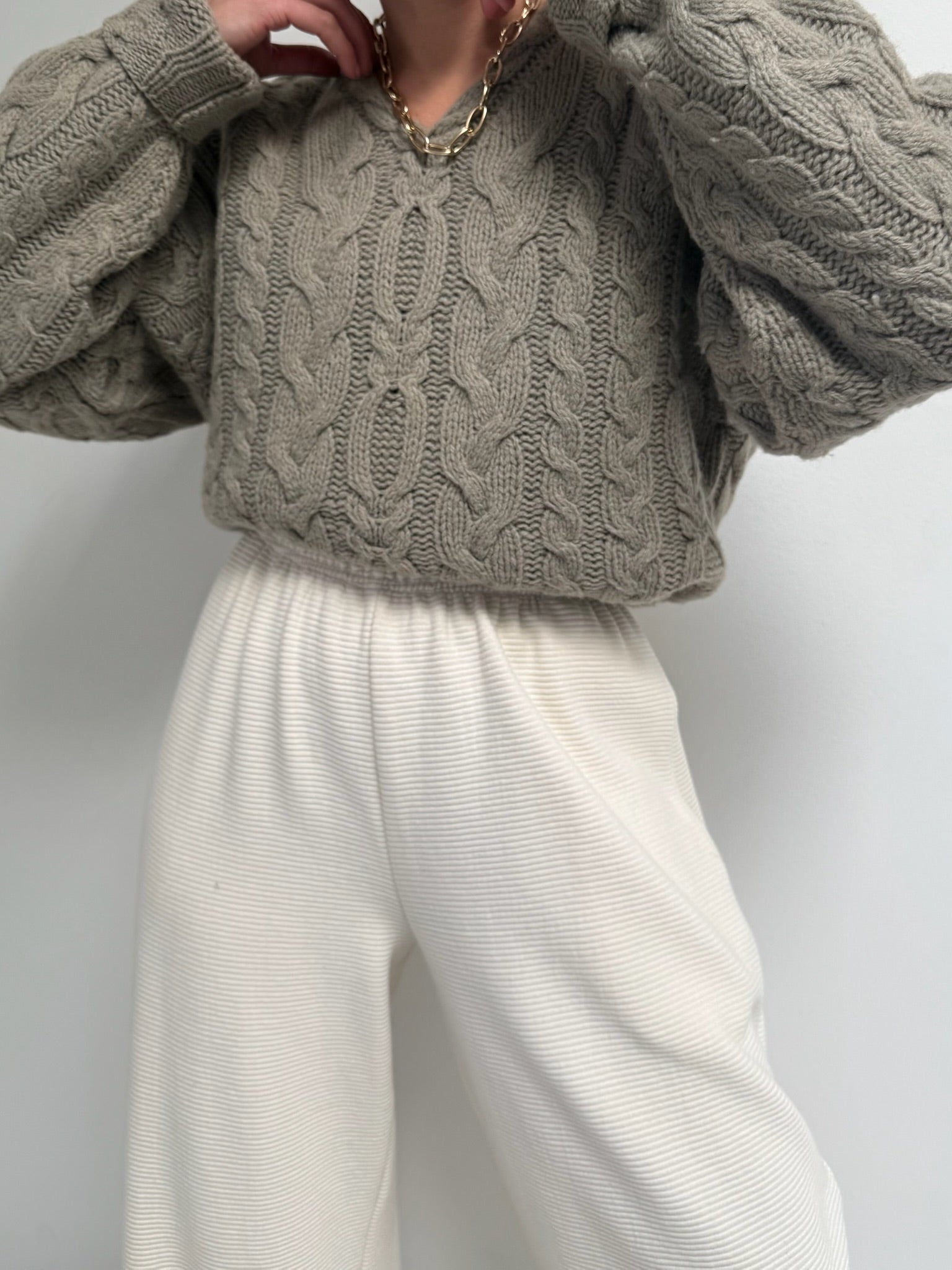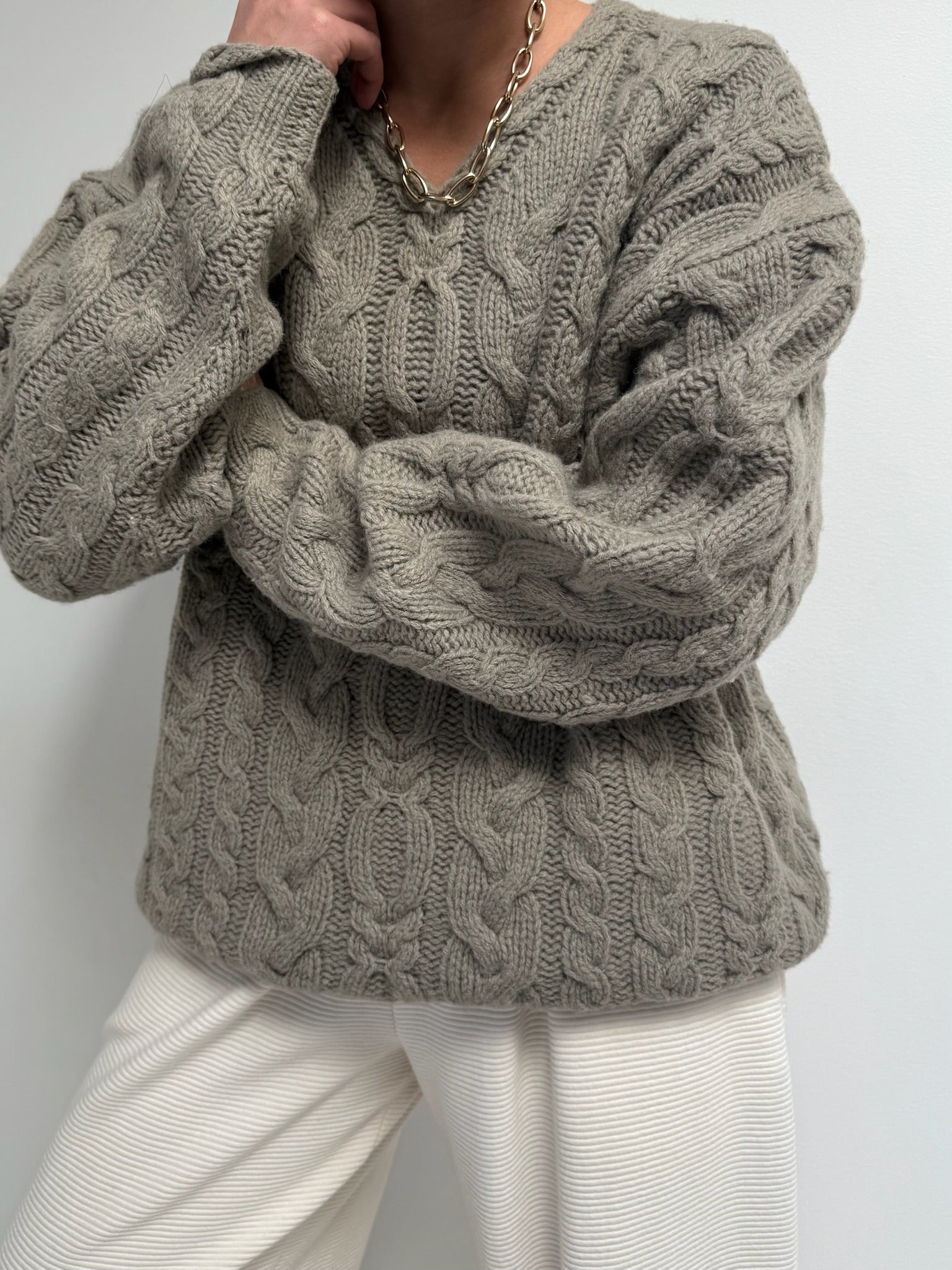 Amazing vintage hand knit sweater in a plush wool fabric & lovely dark taupe tone. Sweater has a shallow v-neckline, dropped shoulders and a longer, relaxed drape.