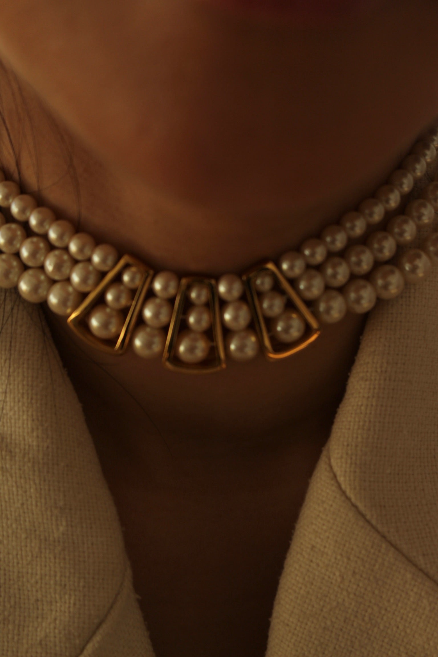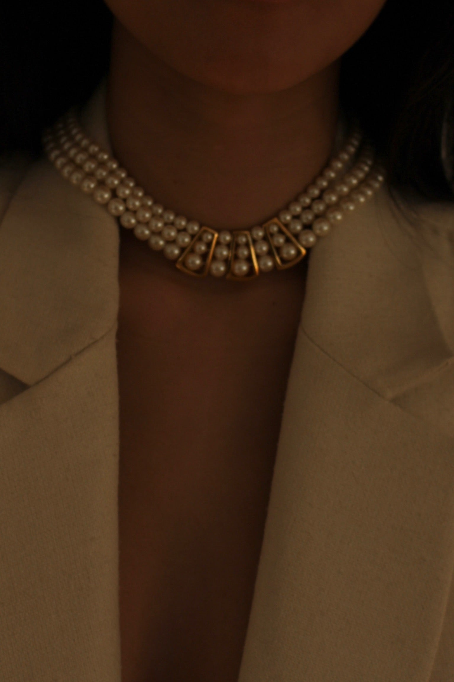 Beautiful vintage necklace with three tiered strands of faux pearls. Necklace has gold framed accents at the front and a simple back clasp closure.