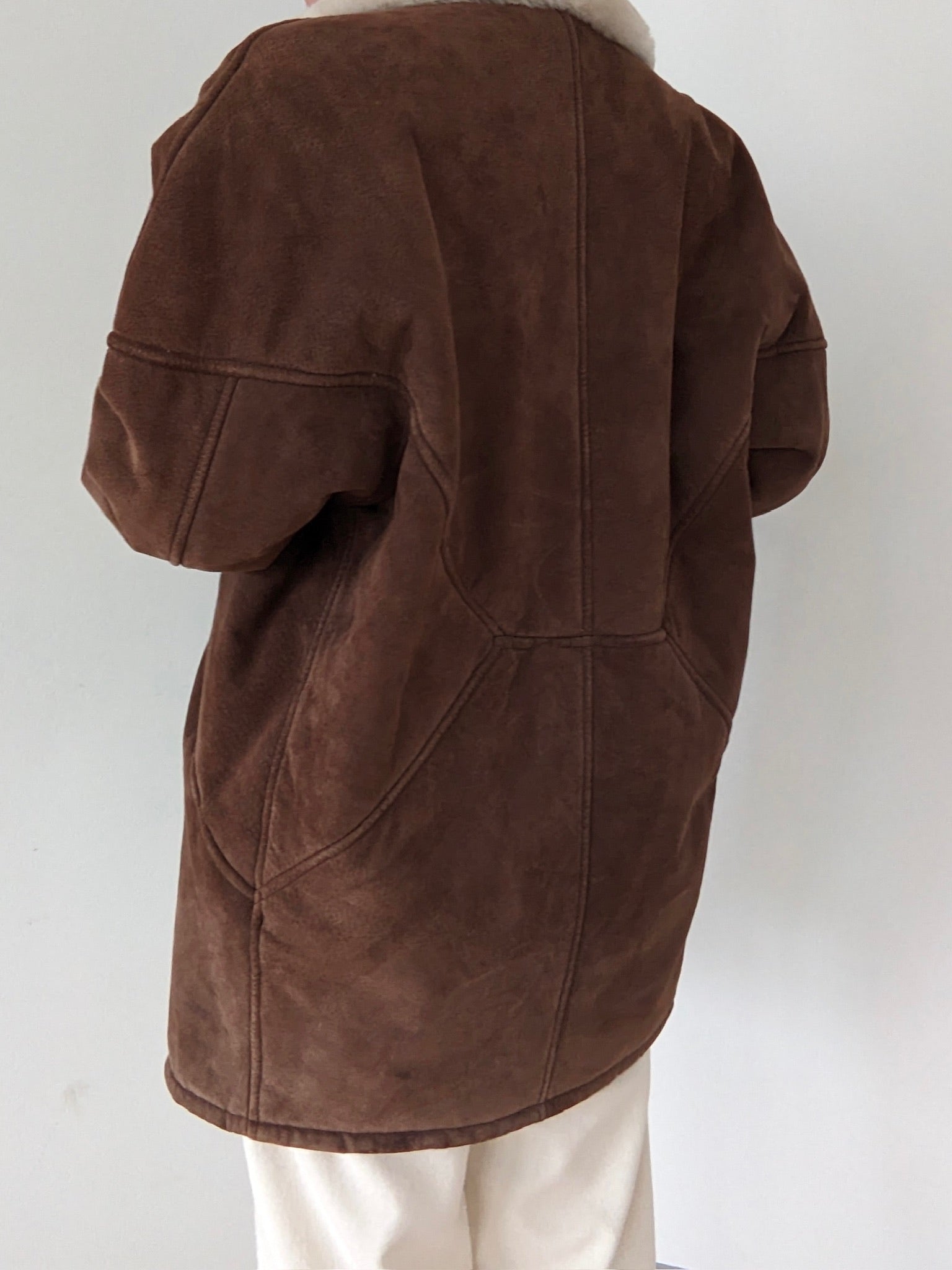 Amazing vintage coat in a walnut brown sueded leather. Coat has the coziest faux fur lining with matching accents at cuffs & collar. Features looped button closures up the front, deep pockets and our favorite dropped shoulder seams.