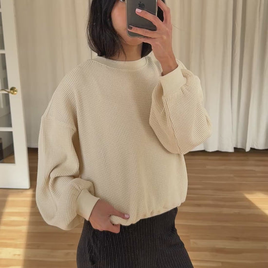 Crafted from substantial waffle cotton, this sweatshirt delivers an elevated take on a wardrobe essential. The relaxed silhouette and generous sleeves create an effortless drape that bridges casual comfort and refined ease—ideal as a layering piece or standalone statement. A versatile foundation for any season.